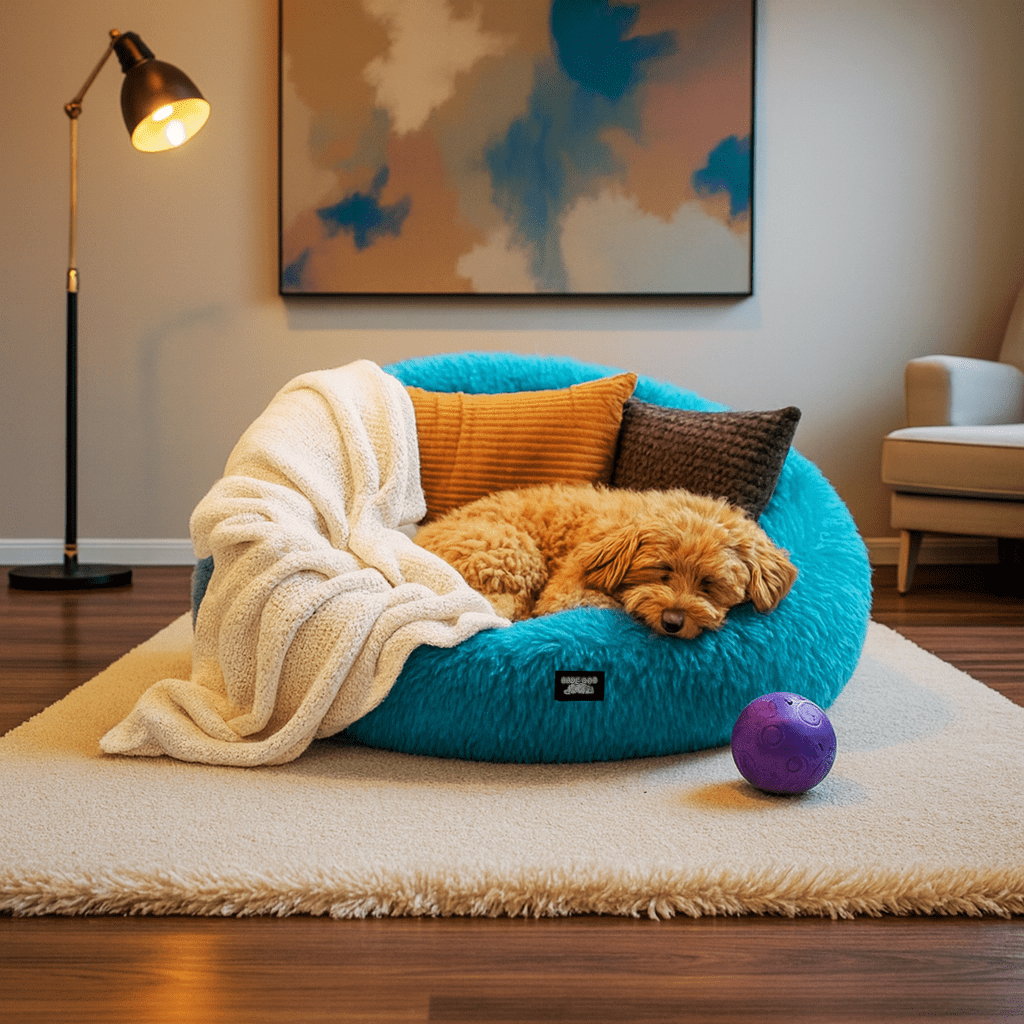 Cool-toned colour therapy + tactile comfort = a calmer, happier pup.